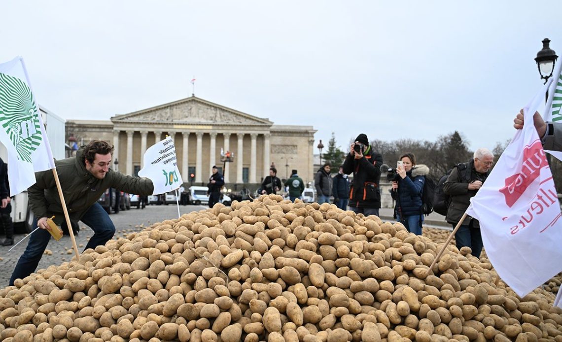 Nacionalna unija proizvođača krompira (UNPT) saopštila je na društvenoj mreži X, sa sjedištem u SAD-u da je krompir distribuisan u blizini mosta Concorde, nasuprot zgrade parlamenta.